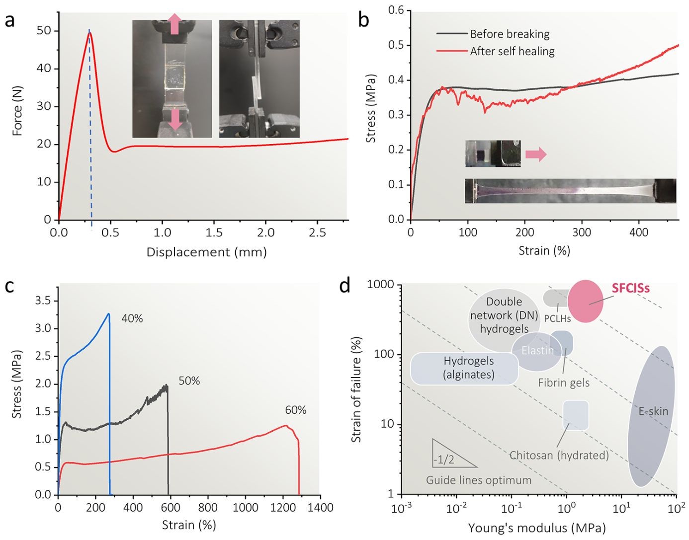 作者采用了两种不同的方法来制备丝素蛋白钙离子电子皮肤(SFCIS),以满足不同应用场景的需求。SFCIS具有高透明性,通过调控钙离子含量可以控制SFCIS在环境中的力学性能,使其与生物组织的模量相当,应用性能更强。同时,SFCIS具有良好的可拉伸性质(伸长率高达1200%)和导电性(1.96 mS·cm-1),能够满足可穿戴器件的需求。在水蒸汽环境中,SFCIS还具有良好的自愈性能。