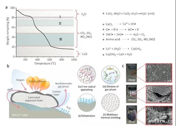 该团队运用热质联用(TGA-MS)表征手段,精确分析了不同燃烧反应阶段下材料各组分的变化,从而推测其阻燃过程包括脱水、炭化层膨胀、多层屏蔽和自由基淬灭等。在极限氧指数测试的实验中,SFCIS表现出可与工程塑料媲美的阻燃性能,并且在燃烧实验中不会发生复燃、熔滴等二次危害行为,极大保障了材料在火灾环境下的安全性。