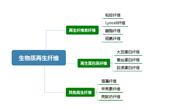 生物质再生纤维是以天然动植物为原料制备的化学纤维,主要包含再生纤维素纤维、再生蛋白质纤维等。再生纤维素纤维是以木材、麻、竹类等天然物质为原料制成的纤维,如粘胶纤维、莱赛尔纤维、铜氨纤维、醋酸纤维等;再生蛋白质纤维是以天然蛋白质为原料,通过化学助剂将其再生和固化制得的纤维,如大豆蛋白复合纤维、蚕丝蛋白复合纤维等,纯蛋白质的再生纤维无法获得可用的力学性质,目前较为成功的成纤方法有两种:一种是将蛋白质的溶液与其他高聚物材料进行共混纺丝(高再生蛋白质含量),另外一种是将蛋白质与其他高聚物进行接枝共聚(低再生蛋白质含量)。除上述 2 类外,生物质再生纤维还包含甲壳素纤维、壳聚糖纤维、海藻纤维等,其分类及主要纤维品类如图 1 所示(包含但不限于以下纤维品类)。