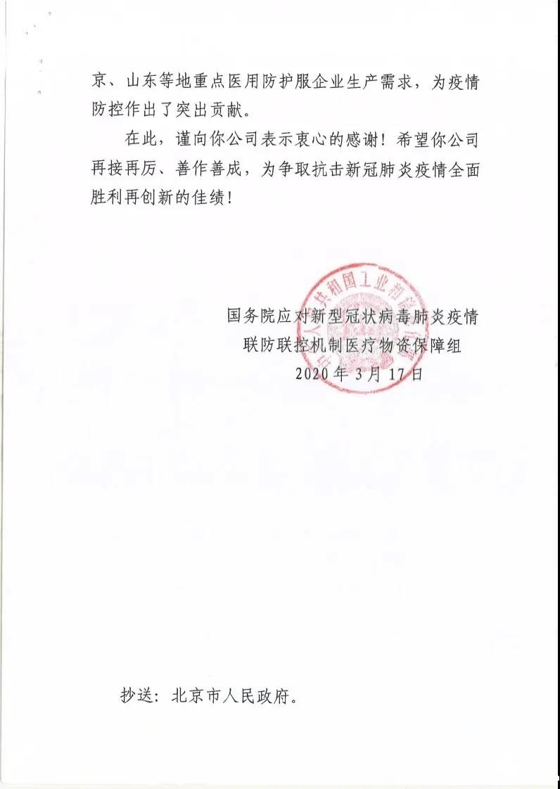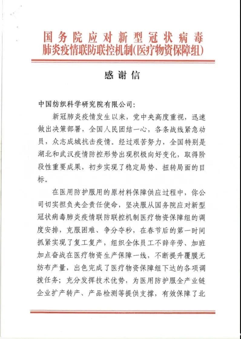 近日,中国通用技术集团中国纺织科学研究院有限公司(以下简称“中纺院”)收到了国务院应对新型冠状病毒肺炎疫情联防联控机制(医疗物资保障组)的书面表彰。作为纺织行业科研“国家队”,中纺院在此次突发的新冠肺炎疫情中高效执行中央保障指令,用实际行动积极践行央企社会责任和使命担当,充分发挥了科研主力军的品牌号召力。