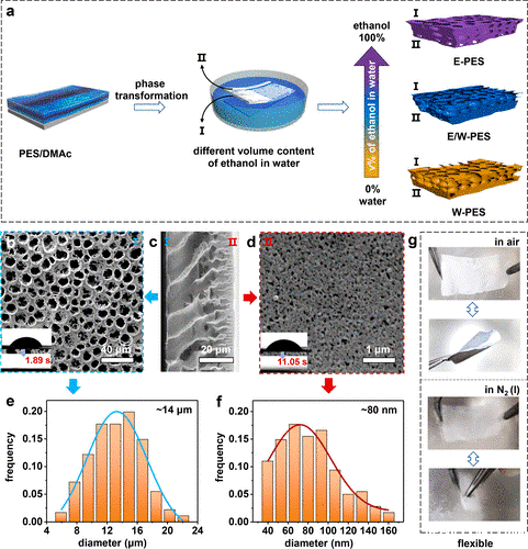 研究者首先通过相转化法制备了不同孔隙尺寸的单层多孔膜,其中膜与玻璃基底接触的I面有较大的孔,II面则形成较小的孔隙。通过调控乙醇/水的体积比,可以获得孔隙从微米到纳米尺度可调控的单层膜。当乙醇与水体积比为7:3时,制备的多孔膜厚度约为38 μm,在室温甚至液氮环境中都具有优异的柔韧性。