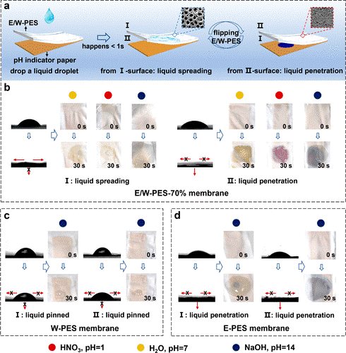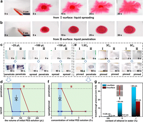 当液滴滴到该PES单层膜上时,液体从II面逐渐渗透到I面,实现克服重力条件下液体的定向运输,此单层膜的“单向导湿”行为适用于不同pH值(1~14)的液体。