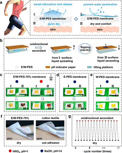 基于PES单层膜的低压液体定向运输行为,汗液可以快速导出,从而避免因为出汗而产生的黏湿和过冷的感觉。相比于传统的棉纺织品,此单层膜具有低粘附力和快速导汗能力,并且可以反复多次使用,具有优异的稳定性。