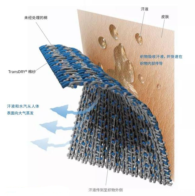 通过对棉花的特殊处理,使其具有一定的疏水性,然后采用疏水处理后的棉纱以及未处理的棉纱两种材料,通过织物组织结构设计,可使水分沿水平或垂直方向传导,从体表转移至织物外层,赋予了棉织物优异的吸湿排汗功能。