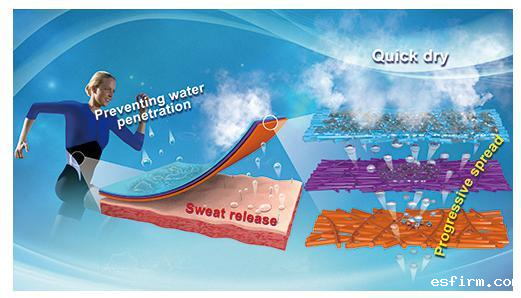 通过静电纺丝技术构建了具有定向性的3层纤维膜功能性吸湿排汗纺织品,该纤维膜具有优异的防水渗透性和反方向连续排汗功能。水解聚丙烯腈-SiO2(HPAN)电纺丝纤维膜被用作外层,以促进毛细作用和排汗。聚氨酯(PU)膜作为内层构建疏水膜,通过诱导形成的渐进润湿性水解PU-PAN(PU-HPAN)作为转移层,引导水从内部渗透到外部层但阻止了反向渗透。微/纳米结构的协同效应和聚合物的优异亲水性基质构建了具有吸湿快干功能的纤维膜,在吸湿速干纺织品领域应用前景广泛。