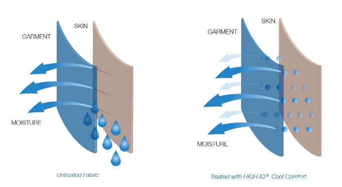 Huntsman(亨斯迈)的HIGH IQ® Cool Comfort吸湿排汗性能保证计划基于业界应用最广、最先进的吸湿排汗技术,它能够使面料中的汗水加速蒸发,迅速带走体内的湿气,让衣服干爽透气。采用HIGH IQ® Cool Comfort计划处理过的面料能生成微型气流,具备独特的通风快干效果,且耐洗涤性能非常好,据称在经过20次家庭洗涤后性能不会出现明显下降。
