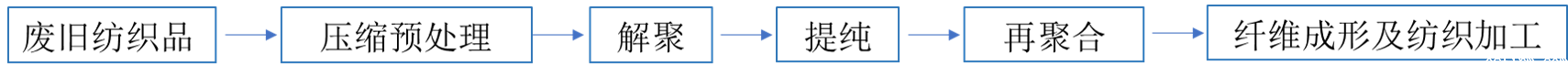 近几年,化学法通过装备和工艺的创新,呈增长趋势,其主要优点是可以实现废弃聚酯的完全循环再生利用;对废旧聚酯的分拣、清洗要求低。化学法的原料可以是废丝甚至是服装中的聚酯成分。从回收意义上看,化学法更有利于解决服装废弃物的问题。随着市场对聚酯产品各种功能化要求的增加,非单一聚酯材料产品使用量快速增加,物理法对这些产品的回收利用已十分困难,只有化学法回收利用才能够解决这些技术难题。
