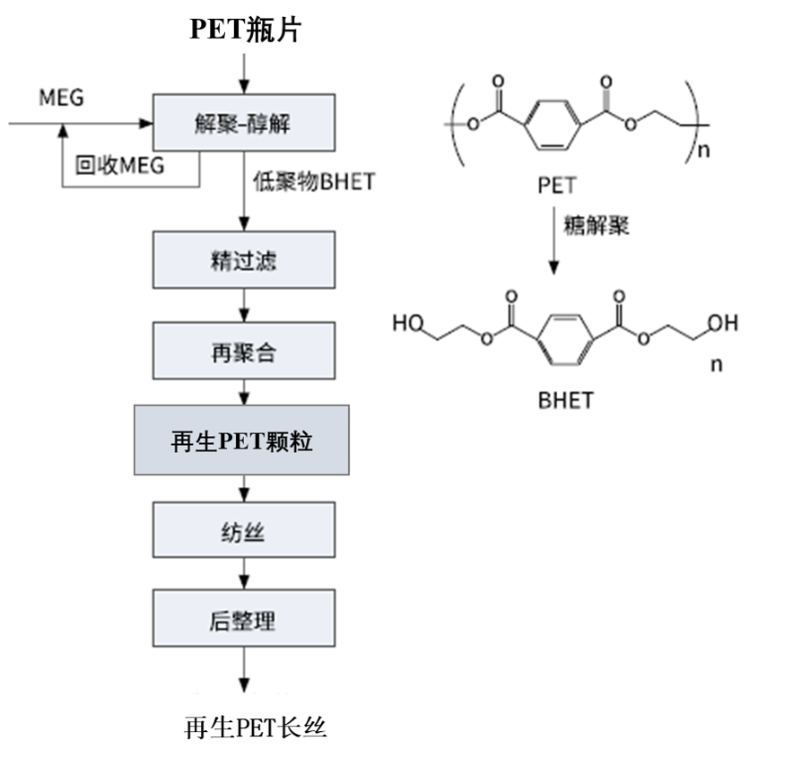 台湾远东新世纪公司通过化学糖酵解法将PET糖酵解产生低聚物BHET,在糖酵解过程之后,低聚物经过精细过滤,接着重新聚合成PET;然后再生PET被纺丝制成纤维。