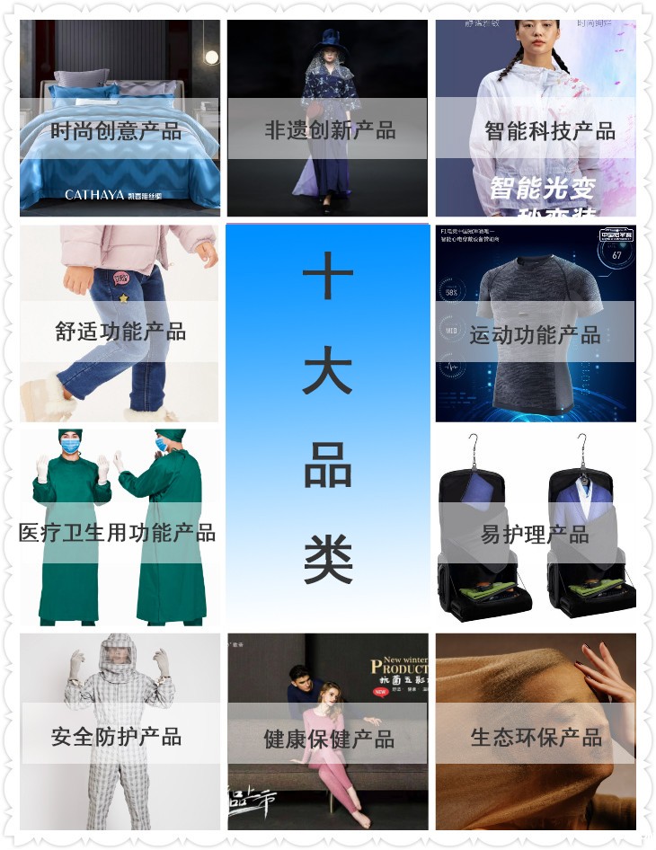 2020年度十大类纺织创新产品申报的“十大品类”是通过对国家政策、行业热点、市场趋势进行深入分析和充分调研而最终确定,囊括了目前市场消费的热点和未来的发展方向,包括:时尚创意产品、非遗创新产品、智能科技产品、舒适功能产品、运动功能产品、医疗卫生用功能产品、易护理产品、安全防护产品、健康保健产品和生态环保产品共“十大品类”。