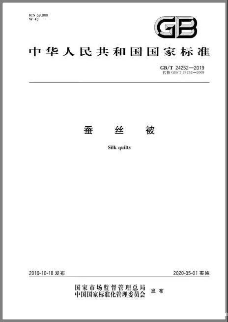 为了规范市场,国家市场监督管理总局(国家标准化管理委员会)发布了GB/T 24252-2019《蚕丝被》国家标准,用以替代GB/T 24252-2009《蚕丝被》,实施日期为2020年5月1日。新标准明确规定了蚕丝被的填充物不得进行增重处理,并在附录中介绍了物理法和化学法两种检测方法。