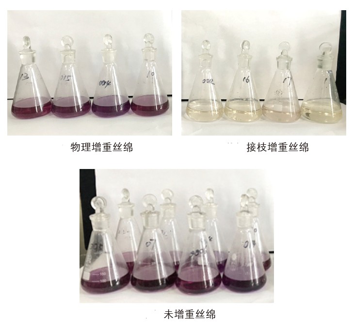 但是,这两种测试方法只适合于测定化学接枝法的增重,无法判定物理增重的丝绵。对于浓盐酸变色法,物理增重的丝绵与未增重丝绵一样,都会水解进而发生变色反应,化学接枝增重的丝绵虽然也会水解,但由于部分官能团与接枝剂产生化学反应形成共价键,无法进一步反应因而不变色或变色程度很小。盐酸析出法也是针对化学接枝的增重,如聚甲基丙酰胺接枝增重,才能有沉淀析出。