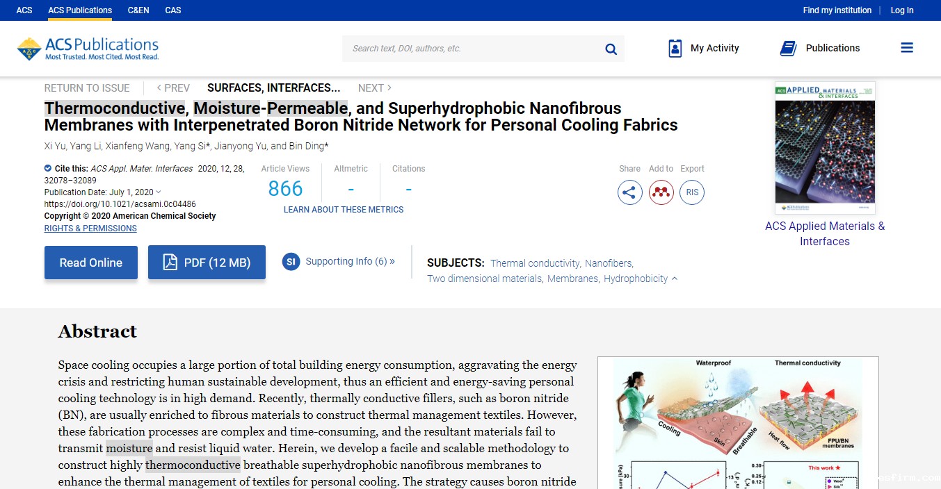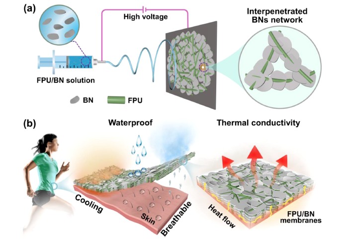 东华大学俞建勇团队研发出一种纳米纤维膜,在具有良好的防水透湿性能的同时,还具有优异的透气性和导热性能。它由独特的聚合物基体(聚氨酯)、疏水性氟化聚氨酯和高导热性的BN纳米片混合后静电纺丝而成,研究人员通过控制BN纳米片的负载率和环境相对湿度(RH)得到了相互渗透良好的BN网络,而BN网络的多孔结构为这种膜的透气性和导热性奠定了良好的基础。与此同时,疏水性聚合物基体的协同作用和膜表面粗糙度的改善,使这种膜还具有良好的耐水渗透性和超疏水性。