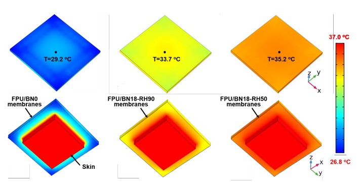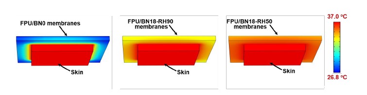 经测试,这种膜的超高平面内热导率为17.9 W / m · K,横面热导率为0.29 W/m · K,高水蒸汽透过率(WVT)为11.6 kg / m2 · day。通过最高温度的建模和计算,可以明显看出FPU / BN0膜、FPU / BN18-RH90膜和FPU / BN18-RH50膜导热性能的差异: