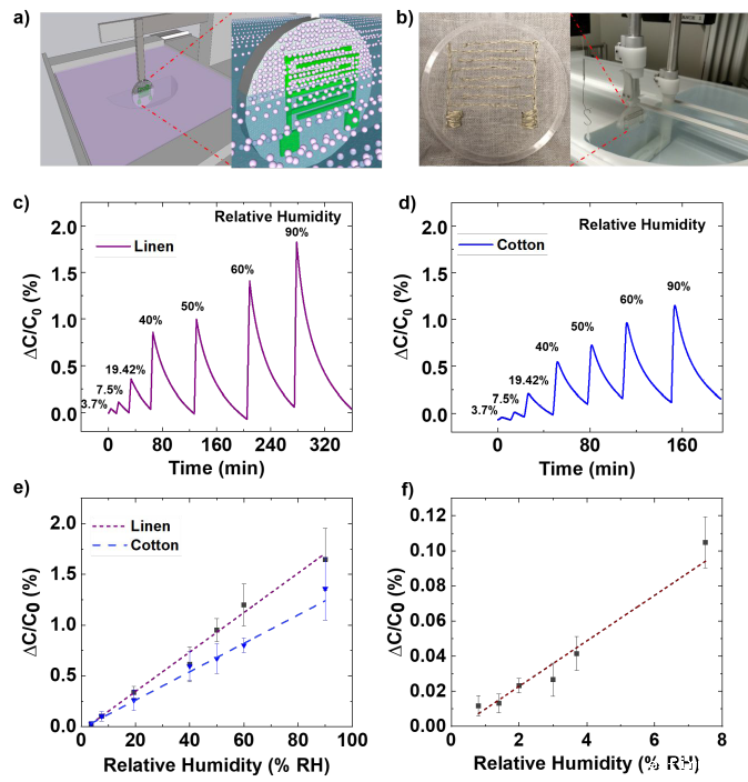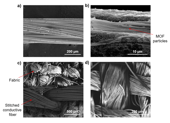 金属有机骨架(MOF)材料不仅具有无机材料高度规整的形貌,而且具有有机材料的多化学功能性特点,因此,MOF是制备智能纺织品的理想材料之一。基于此,沙特阿拉伯阿卜杜拉国王科技大学的研究人员以MOF为活性功能层对亚麻和棉两种织物进行功能改性,制备出了高性能柔性湿度传感器(TEX)。