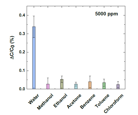 此外,研究团队对混合气体氛围条件下该湿度传感器对湿气的选择性进行测试。在水、甲醇、乙醇、丙酮、苯、甲苯及氯仿的混合氛围下(VOCs 5000 mg/kg),TEX对水蒸汽呈现明显的高选择性。该研究成果对MOF材料以及其他纳米功能材料在智能纺织品构筑方面的应用具有一定的指导意义。