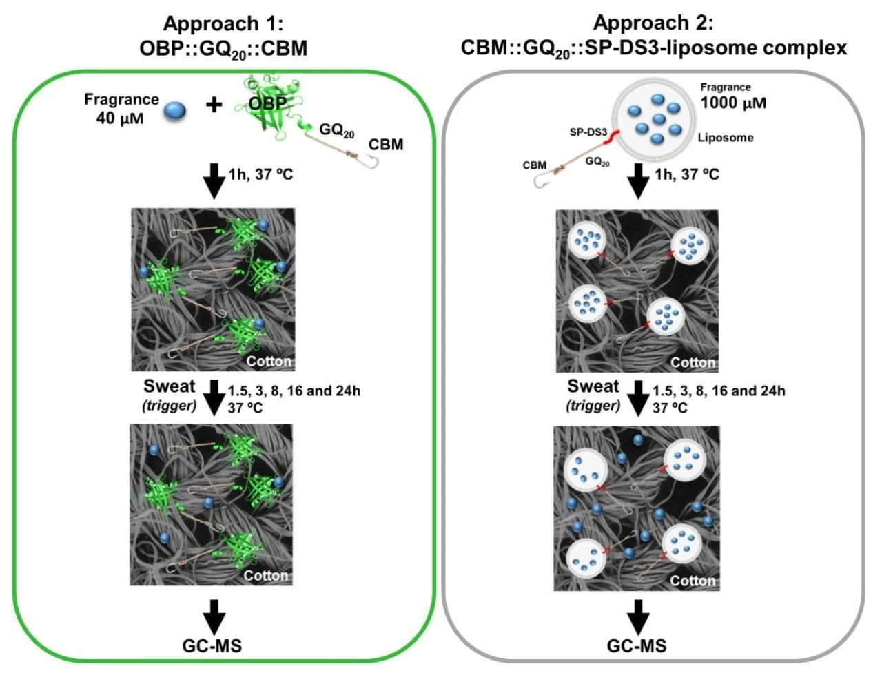 除微胶囊整理技术外,葡萄牙米尼奥大学的研究者通过对棉织物的功能性修饰使其能够散发出令人愉悦的柠檬香气。第一种方法是先将从野猪身上提取的蛋白OBP-I与来自纤维瘤菌FIMI的CBMN1融合,然后与棉织物功能化芳香前驱体一起培养,最终制得功能化棉织物。第二种方法是把碳水化合物结合模块CBMN1与SP-DS3肽融合,将蛋白质锚定在含有香味的脂质体中,再将功能化的脂质体用于棉织物的整理。采用两种方式制备的功能性棉织物在与酸性汗液接触时均可以释放出香茅醇(一种带香味的物质)。