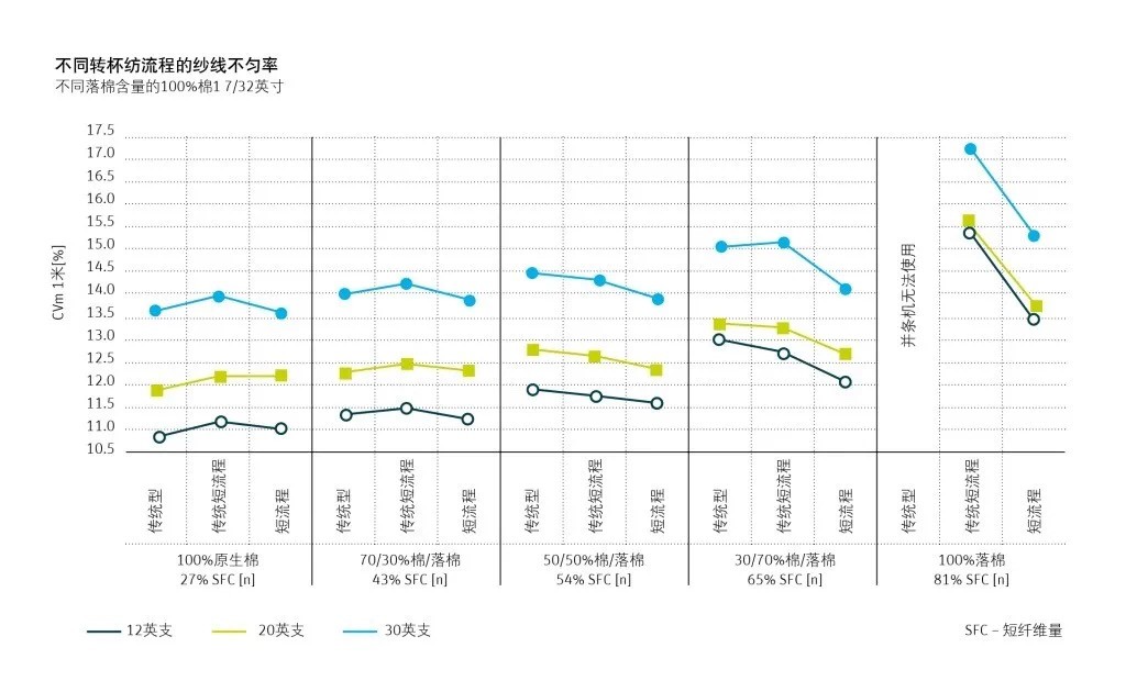 在这项研究中,采用自调匀整并条机的传统转杯纺短流程完全无法达到理想的效果。但在客户无法选用理想工艺流程时,这种流程可用作折中方案。