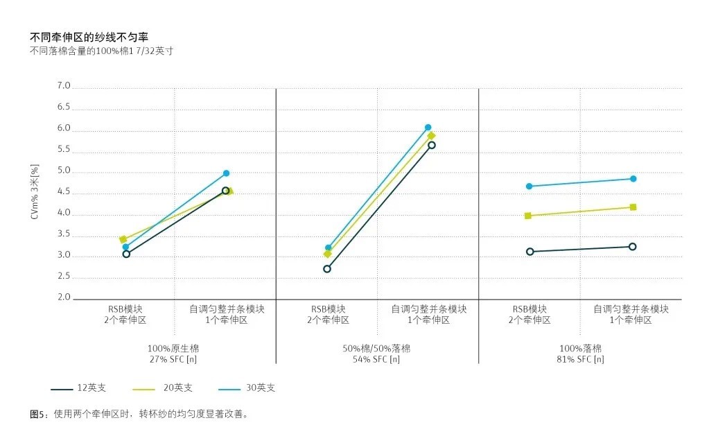 而采用市场上仅含一个牵伸区的其他解决方案时,纱线均匀度会显著变差,而且在加工长棉条段时尤其明显,比如3米定重变化会非常大(CVm% 3米;图5)。这会导致最终成品中出现“条纹”瑕疵。