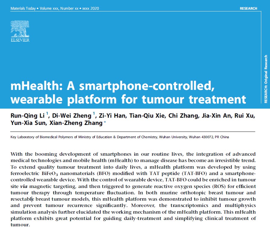 随着智能手机的蓬勃发展,将先进的医疗技术与移动端集成已成为一种不可阻挡的趋势。最近,武汉大学张先正研究团队搭建了一个mHealth平台,通过手机端控制的可穿戴装备定向释放靶向物质,可以用于肿瘤的治疗。