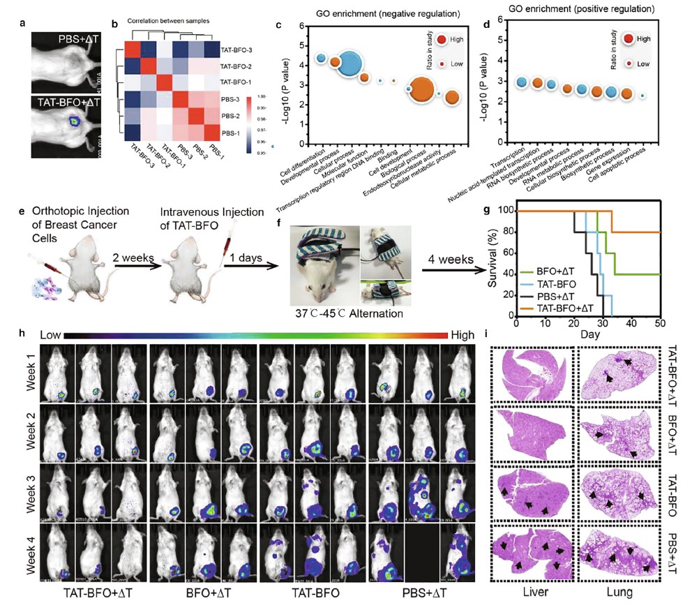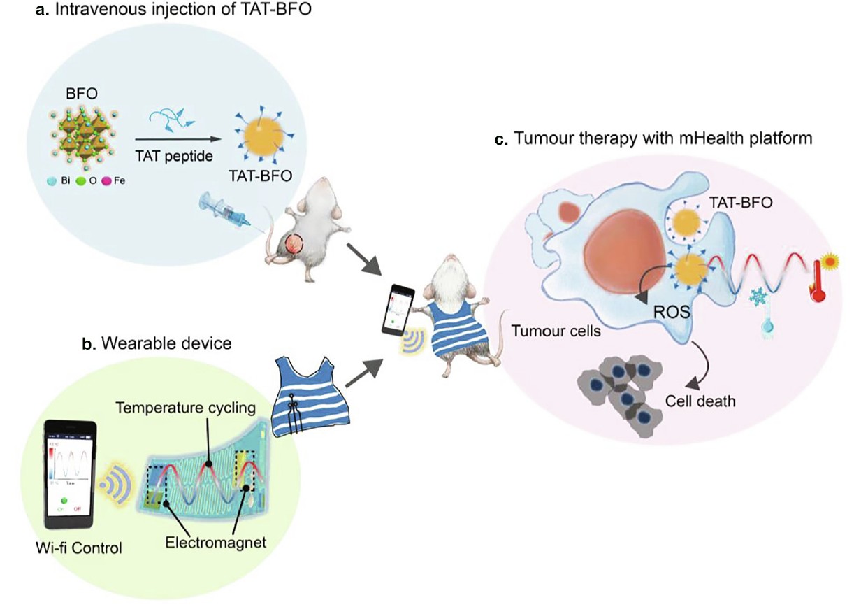 在研究人员搭建的mHealth平台上,可以使用手机端控制可穿戴设备,将经过TAT肽修饰的BiFeO3纳米材料(BFO)——TAT-BFO通过磁性靶向富集在肿瘤部位,利用温度的波动触发TAT-BFO产生活性氧(ROS),用于肿瘤的治疗。