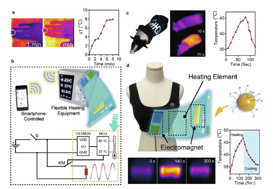在研究可穿戴设备时,研究人员通过实验测试了光变和温变两种形式,最终选择了温变来触发靶向物质。这套可穿戴设备的温度调节范围控制在37℃~45℃,可以根据手机端发出的信号调节发热区域和温度,定向释放靶向物质治疗肿瘤。