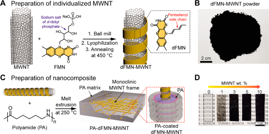 韩国延世大学Sang-Yong Ju教授团队和韩国工业技术研究所No-Hyung Park教授合作研发了一种具有高导电率的聚合物-多壁碳纳米管(MWNT)纳米复合材料,该纳米复合材料的电导率超过了100 S/m,成为迄今为止公开报道中聚合物/多壁碳纳米管纳米复合材料的最高值,在电磁屏蔽材料领域的应用极其广泛。