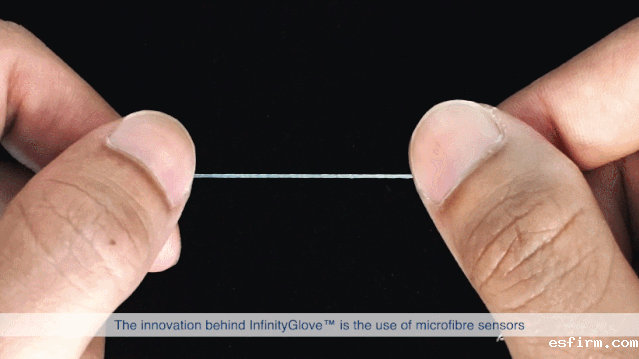 InfinityGloveTM智能手套的突破性创新在于,它采用了一根内部填充有液态导电金属且带有弹力的橡胶状超细纤维作为传感材料,细度相当于几根头发。当少量电流流过导电的液态金属时,会发出可读取的电信号,而纤维发生弯曲时,这些信号也会随之变化。