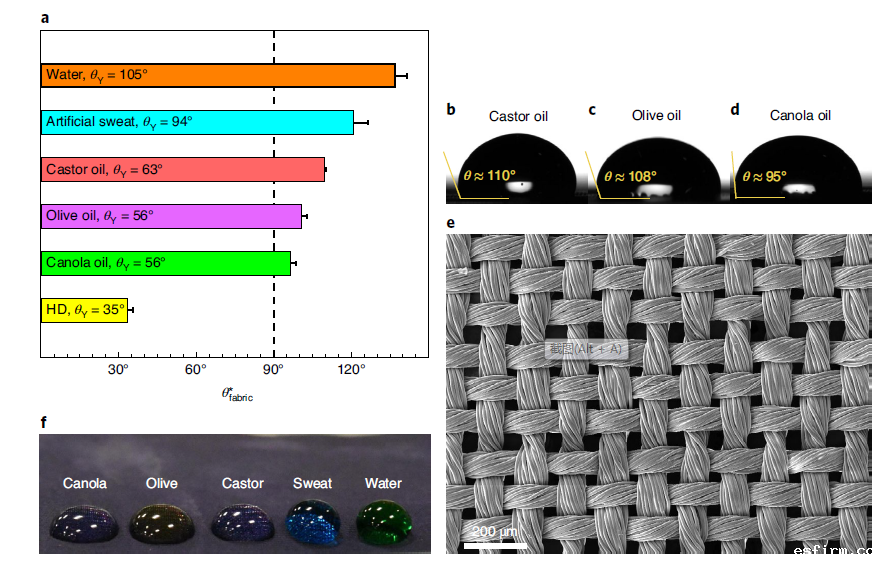 近日,哥伦比亚大学公布了一种新型的拒油纺织品,该产品在制备过程中不使用PFC。研究者在每根纤维表面添加纹理,通过控制纹理的大小、间距等来控制纤维材料的表面化学性质,从而实现其拒油功能。实验结果表明,对于表面张力低至23.9 mN/m的液体,纺织品仍保持不润湿,并对菜籽油、橄榄油和蓖麻油等均具有良好的疏离作用。