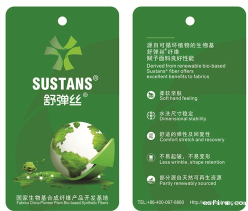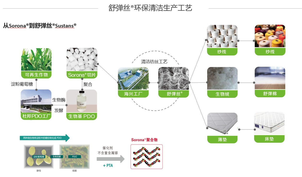 目前,Sorona®可以加工成4种不同的纤维形式,可以单独使用或者与其他纤维混纺,带来不同的产品体验。这4种形式分别是单组分长丝、双组分长丝、单组分短纤以及双组分短纤,舒弹丝®是DuPont(杜邦)授权海兴凯晟科技有限公司(国家生物基合成纤维产品开发基地)生产的双组分短纤维,也是目前世界上唯一一种达到工业化生产水平的弹性短纤维。