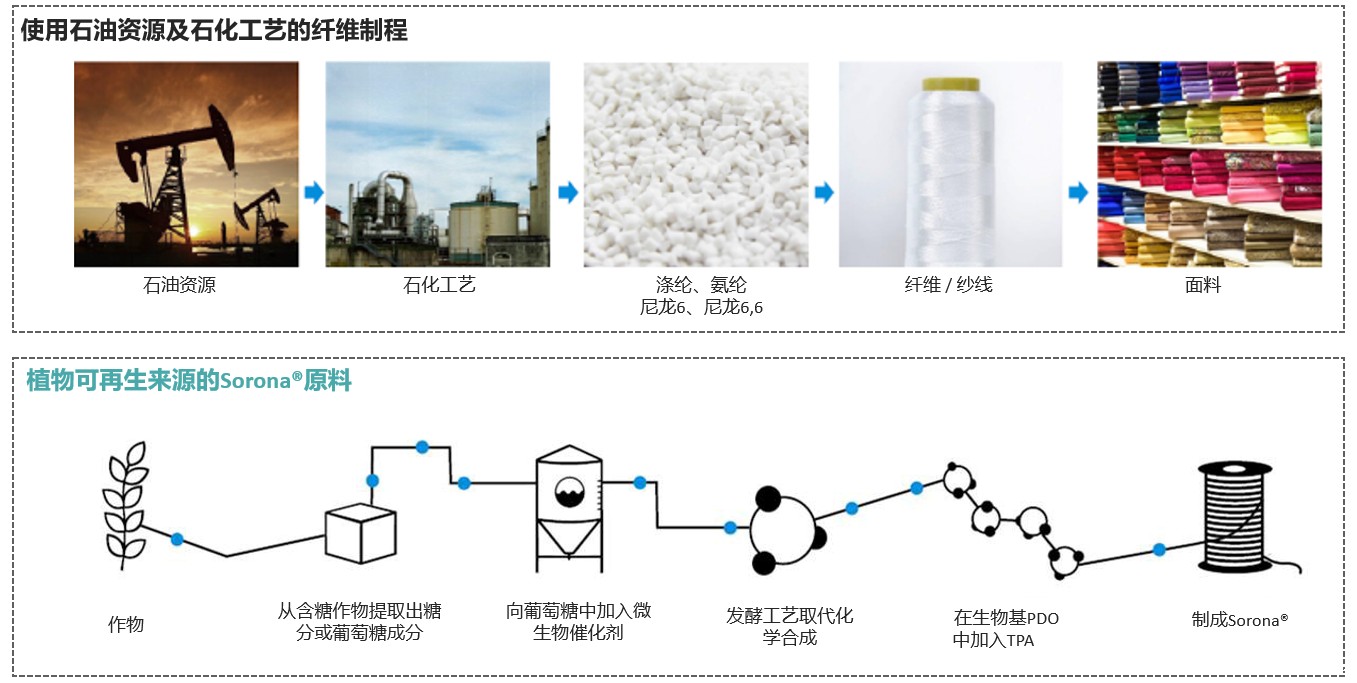 一开始1,3-PDO的生产成本较高,限制了PTT的商业化生产,DuPont(杜邦)经过多年的技术积累,最终通过生物工程技术,以植物来源的葡萄糖为原料,实现了1,3-PDO的商业化,并开始生产商品名为“Sorona®”的PTT树脂,而Sorona®纤维中的生物基成分也是源于聚合中使用的生物基1,3-PDO。
