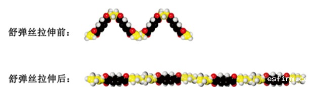 氨纶具有高弹性是因为其高分子链是由低熔点、无定形的“软”链段为母体和嵌在其中的高熔点、结晶的“硬”链段所组成,伸长可达400%~800%,但其弹性会受到染整化学条件和使用环境的影响;与氨纶的弹性机理不同,舒弹丝®的弹性来自纤维形变的伸缩弹性,将其卷曲拉直后伸长量大约在20%~30%,具有良好的耐久性和拉伸回复性。