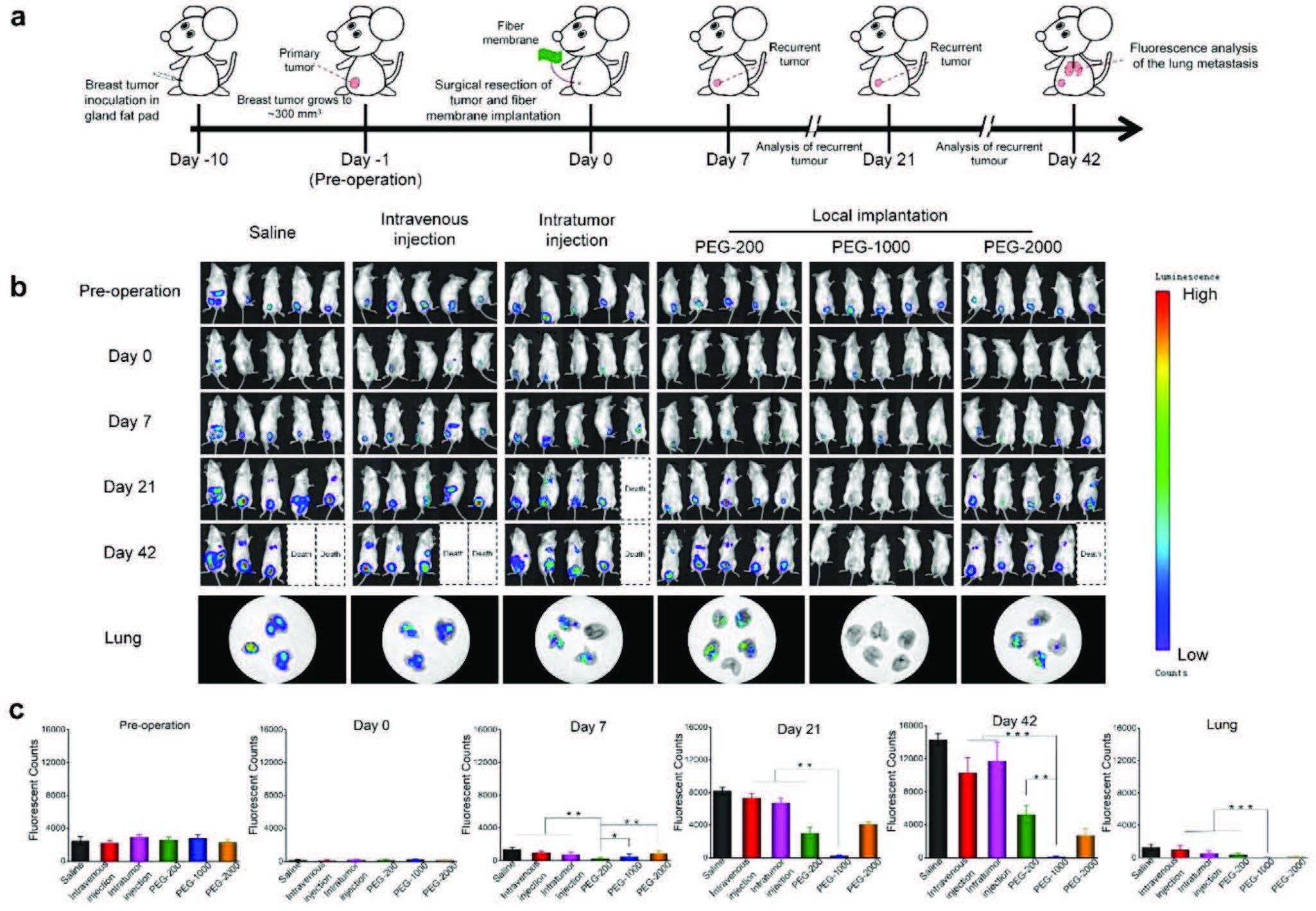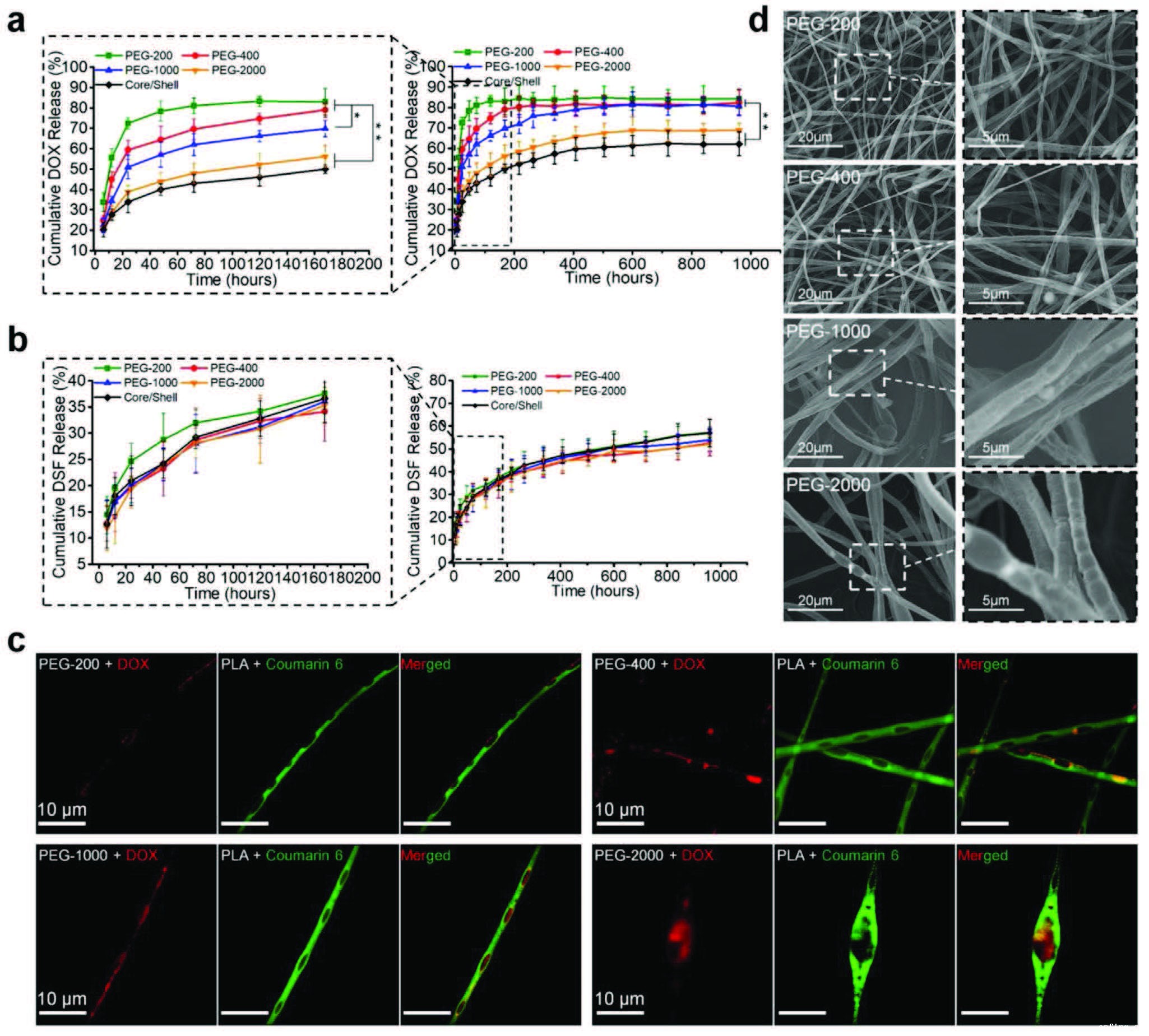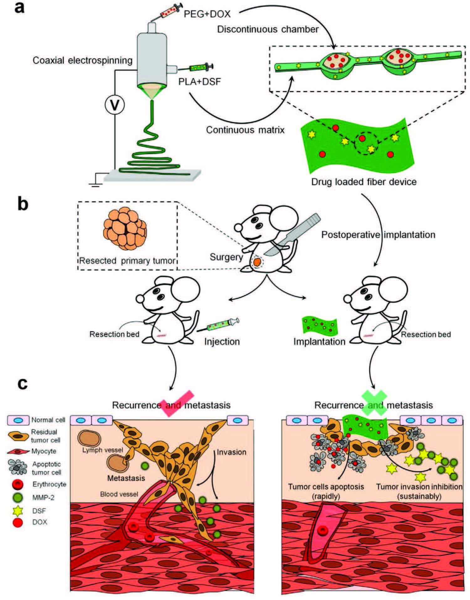 研究人员利用同轴静电纺丝技术来制备该纳米纤维,其纤维基体为负载双硫仑(DSF)的聚乳酸(PLA),腔室中为负载盐酸阿霉素(DOX·HCl)的聚乙二醇(PEG)。植入体内后,腔室中的DOX·HCl从纤维中迅速释放,消除了残留的肿瘤细胞,防止了肿瘤的局部复发;纤维基质中的DSF可持续释放,阻止了肿瘤细胞侵入周围组织,从而防止了转移的发生。