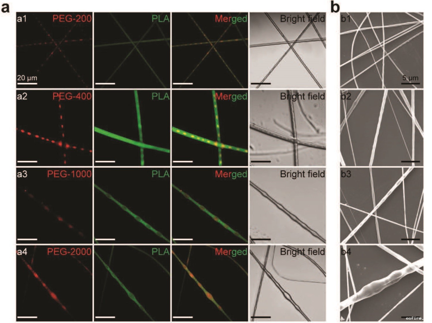 研究表明,在静电纺丝过程中,PEG溶液中的水分蒸发可形成腔室的空腔,而且腔室的体积足够大可用于封装DOX · HCl。腔室的容积和间距大小可以通过改变PEG的分子量实现,而且腔室的大小对封装在其中的DOX · HCl的释放速率影响很大。