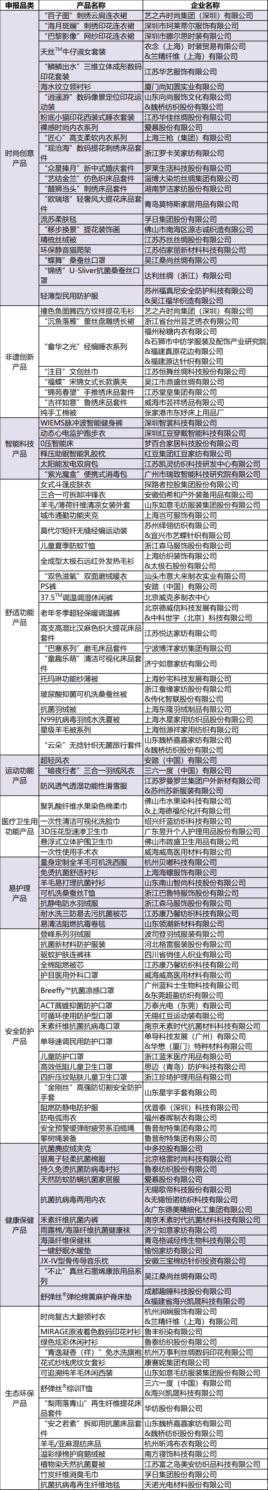 附件:培育和推广2020年度十大类纺织创新产品拟获选产品及单位名单