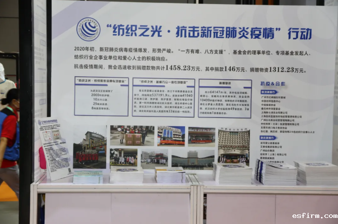 此外,纺织之光科技教育基金会还对“纺织之光·抗击新冠肺炎疫情”行动进行了展示。2020年初,新冠肺炎疫情爆发,形式严峻。“一方有难,八方支援”,纺织之光科技教育基金会的理事单位、专项基金发起人、纺织行业企事业单位和爱心人士积极响应。据纺织之光科技教育基金会理事长叶志民介绍,疫情期间,纺织之光科技教育基金会迅速收到捐赠款物共计1458.23万元,其中捐款146万元、捐赠物资1312.23万元,为抗击新冠肺炎疫情做出了突出贡献。