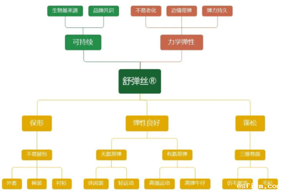 从纤维本质上讲,一方面,舒弹丝®的生物基成分使其符合可持续发展理念;另一方面,舒弹丝®与氨纶不同的弹性来源,使它的弹性更加持久,耐酸碱且不容易老化失弹。作为一种双组分生物基弹性短纤维,无需做包芯纱的加工,即可以通过混纺方式很均匀地分布在面料中,很好地解决了在服装加工和使用过程中,由于弹性包芯纱的“芯”回缩而造成的边缝失弹的问题。