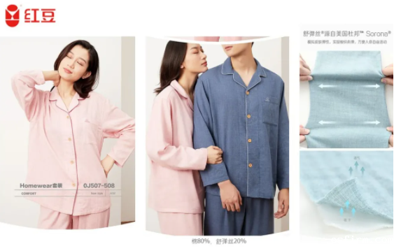一种是“无氨带弹”(指不加入氨纶即有弹性效果)面料,为面料提供舒适的弹性体验,满足消费者小幅度活动不受限的需求。例如,红豆在水洗棉家居服中加入了20%的舒弹丝®,改善了传统棉质家居服因为捻度低、织物组织结构松散带来的水洗变形问题,并为穿着者提供了舒适的弹性体验。
