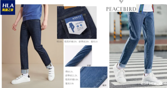 另一种是“有氨带弹”(指加入氨纶的弹性效果),这是舒弹丝®可以充分发挥其良好的耐久性和回复性,辅助面料中的氨纶回缩,从而使面料中的氨纶不易疲劳,适合用于中高强度运动服装、高弹牛仔等领域。例如,海澜之家利用舒弹丝®开发的高弹牛仔系列。