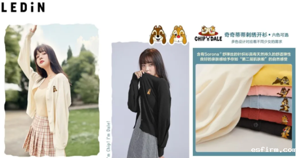 舒弹丝®的三维卷曲结构可以很好地提升面料的蓬松感,这一优点可以用于仿毛、毛衫等面料的开发中。乐町在一款迪士尼联名款开衫中加入了舒弹丝®之后,不仅获得了柔软蓬松的手感,而且还利用了舒弹丝®保形性好的优势,改善了开衫洗涤晾晒时可能造成的下垂、鼓包等问题。