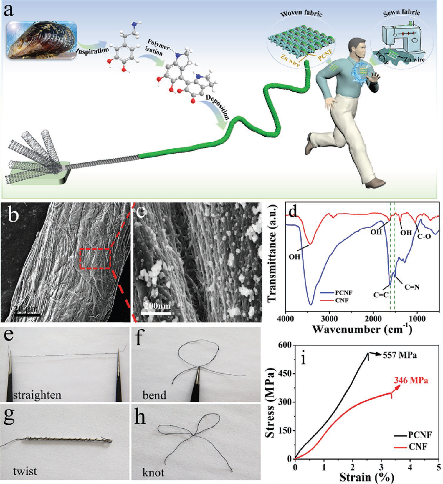 研究人员选择碳纳米管纤维(CNF)作为碳基质,将CNFs放入多巴胺溶液中,使得多巴胺在CNF表面形成聚多巴胺(PDA),将PDA包覆的CNFs作为阴极(PCNF)。将制备好的PCNF和锌丝通过织机织成织物,制成储能纺织品。涂刷聚乙烯醇(PVA)凝胶电解质后,该储能纺织品可以为各种电子设备供电。