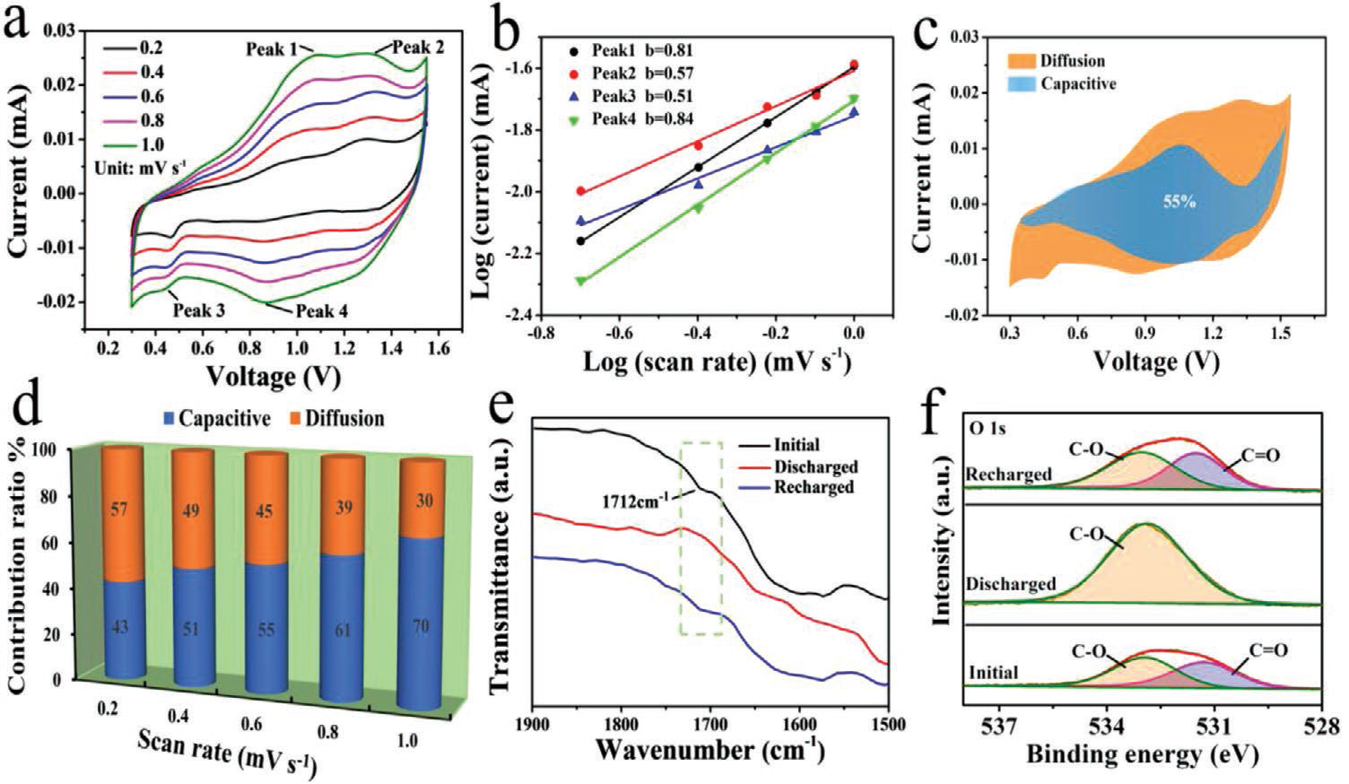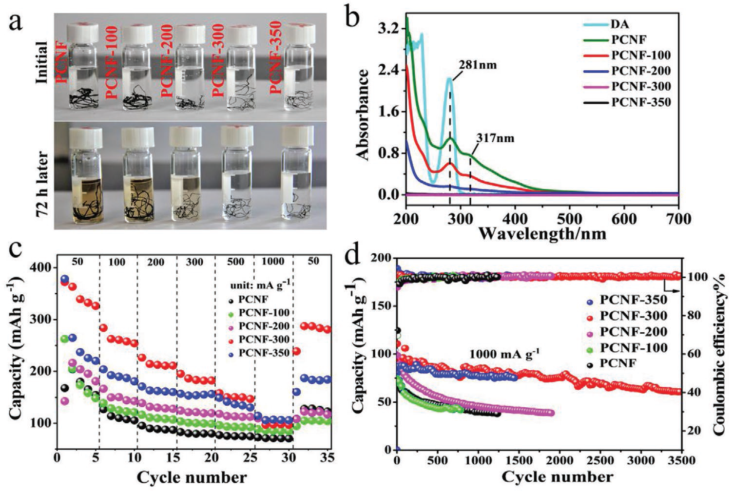 为了去除残留的多巴胺,并且提高PCNF中具有氧化活性的醌基的比例,研究人员对聚合得到的PCNF样品分别在不同温度下进行热处理。研究结果表明,热处理温度为300℃时,PCNF电极的耐电解质和电化学性能优良。