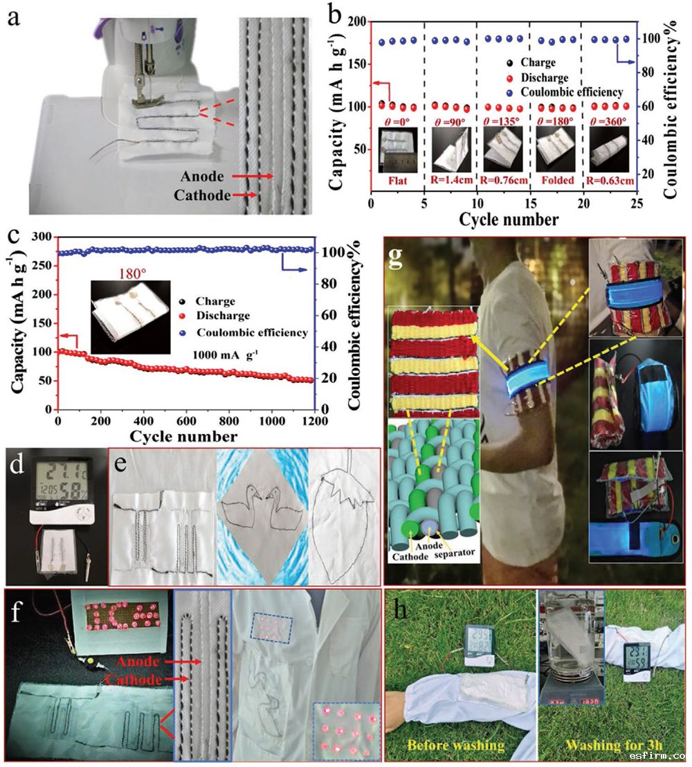 研究人员通过缝纫机将储能纤维缝制成特定图案的储能纺织品,不管在弯曲还是洗涤条件下,该储能纺织品均能为各种电子产品稳定供电。