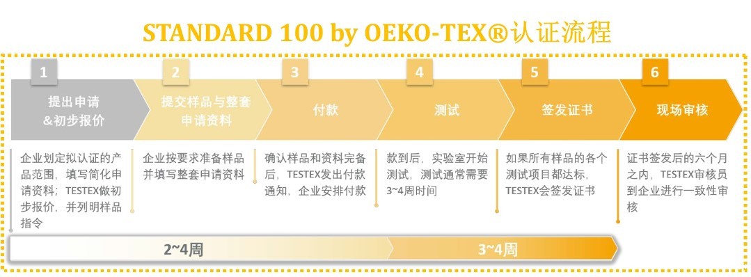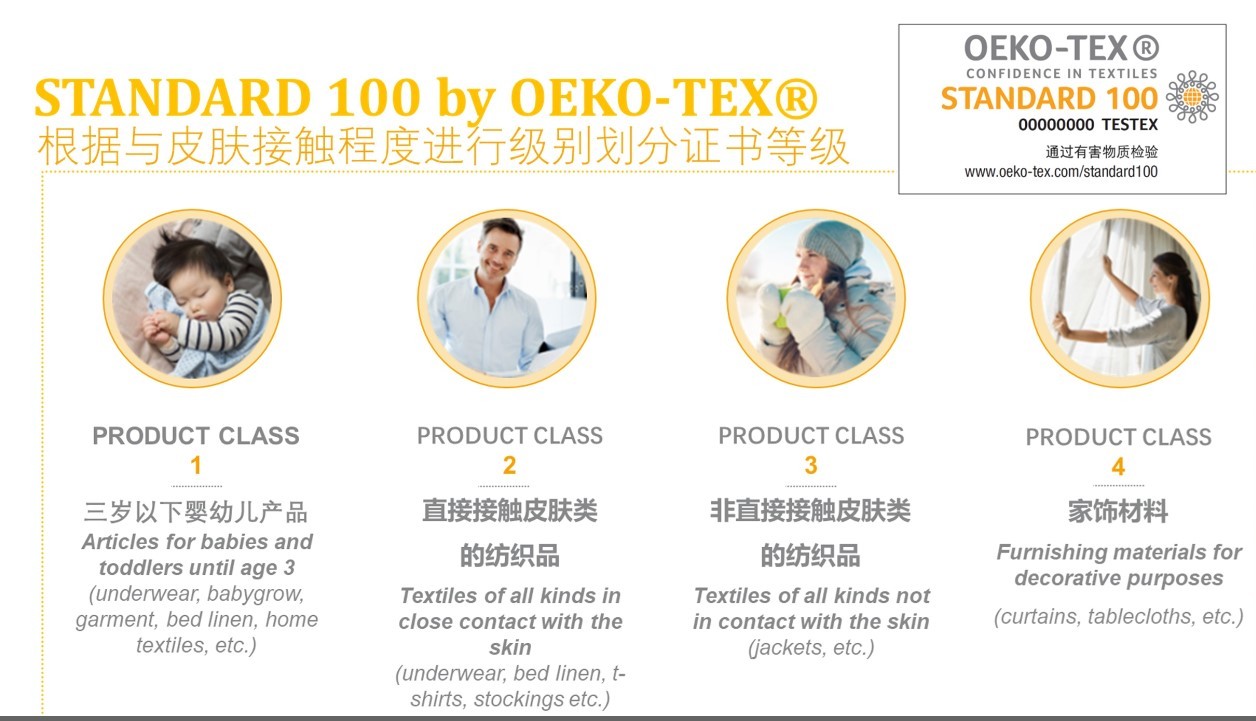 原则上,所有加工阶段的纺织品,从纱线到面料、辅料及成品,都适用于STANDARD 100认证。每种不同的产品都必须根据其产品特性、加工工艺、所使用的染化料的不同,达到所对应检测项目的限量值要求。