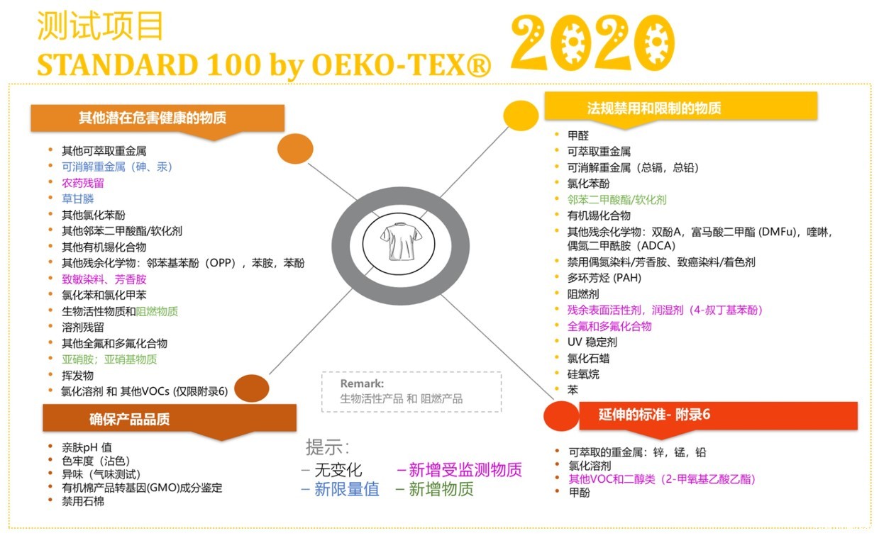 如果一件纺织成品带有STANDARD 100标签,便可以确定该成品的所有部件,包括面料、线、纽扣和所有其他辅料,都已通过了有害物质检验,因此该制品在人类生态学方面是无害的。该检测是由TESTEX(特思达)在瑞士的独立实验室根据STANDARD 100 OEKO-TEX® 标准进行的,标准共涵盖了二十余大项,三百余小项的检测项目,将绝大多数可能对人体健康有害的受管制和非受管制的物质都纳入考量。在许多情况下,STANDARD 100的限量值都超出了国家和国际标准,标准目录每年至少更新一次,并根据最新的科学发现或法定要求进行扩展。