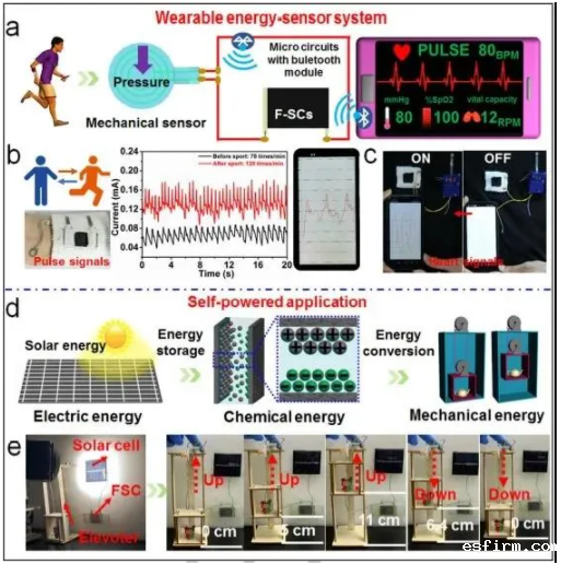 基于以上研究,将FSCs与压力传感器集成到织物中,形成可穿戴式储能-传感系统,可实时稳定监测人体的各种生理信号,例如手腕脉搏、心跳、手指、背部和颈部弯曲等信号,为FSCs在可穿戴领域的实际应用提供新途径。