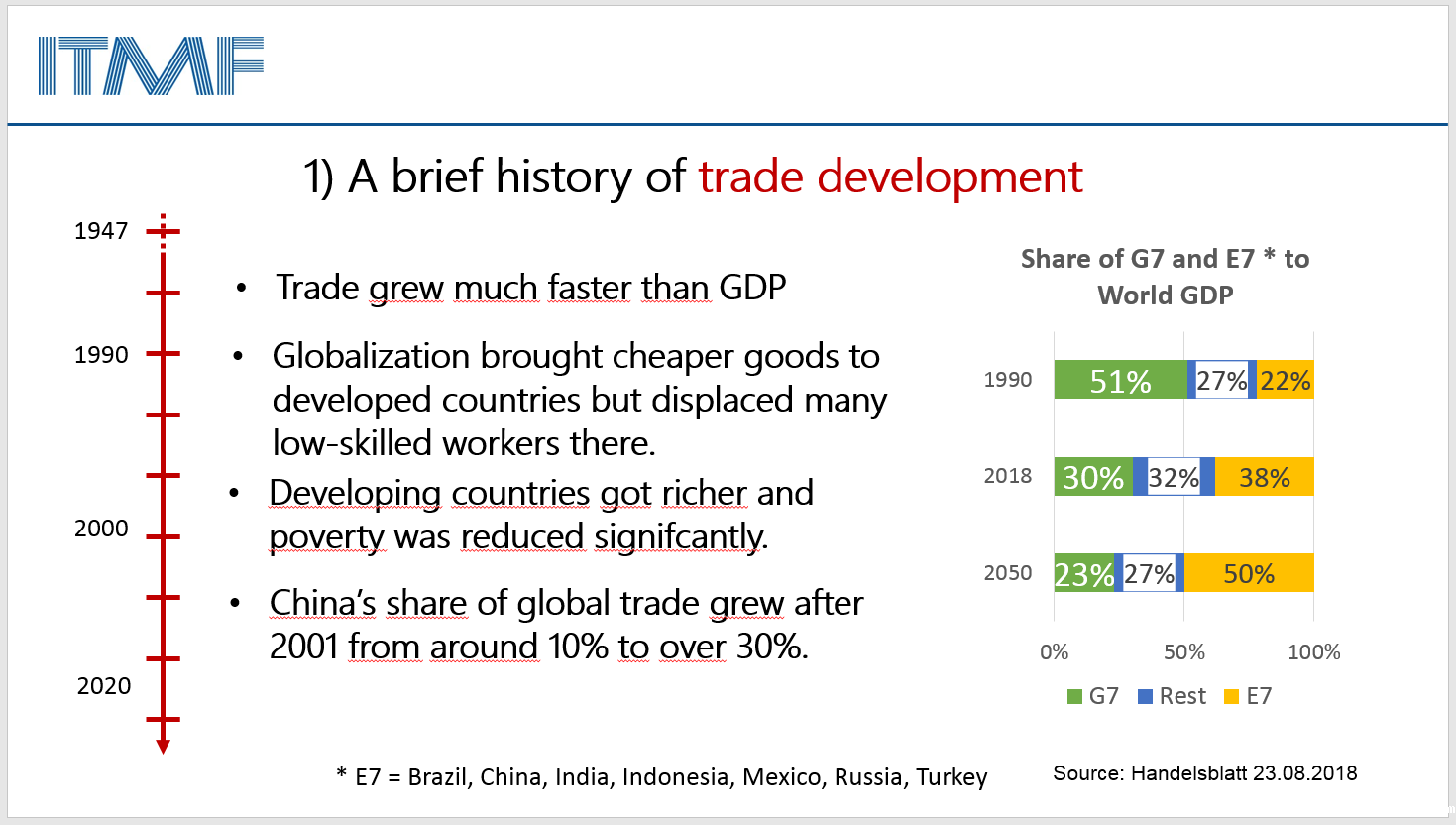 1947年,23个国家政府缔结了《关税与贸易总协定》,这意味着其组织内成员需削减关税和其他贸易壁垒,在互惠互利的基础上消除国际贸易中的差别待遇。对于中国而言,20世纪70年代末期实现的改革开放是融入全球经济发展的重要起点。1995年,世界贸易组织(WTO)成立,取代了《关税及贸易总协定》来处理商品、服务和知识产权的交易规定。