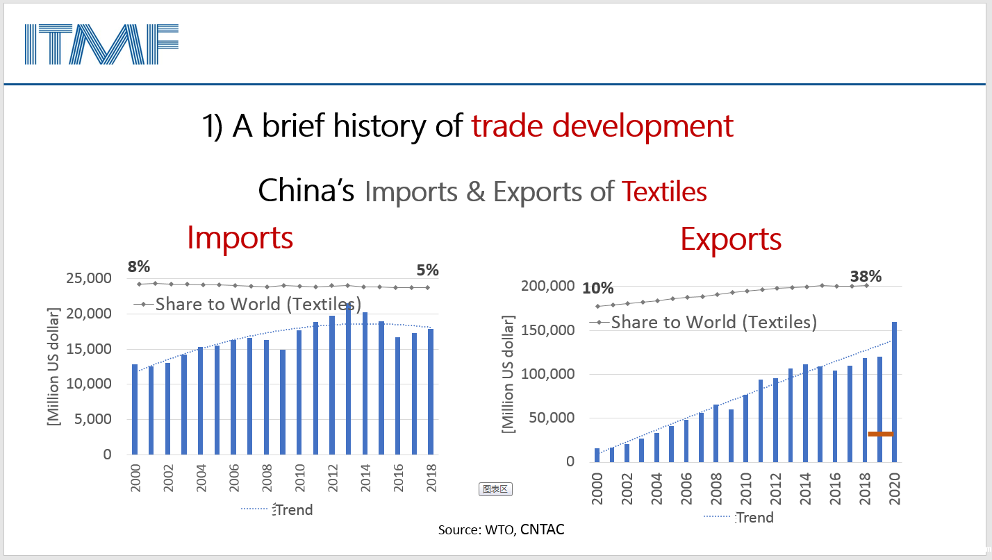 国际纺织制造商联合会(ITMF)秘书长Christian P. Schindler发表了题为《全球纺织产业面临的机遇与挑战》的视频演讲,回顾并总结了过去70年来全球宏观贸易和纺织行业的贸易发展情况,通过ITMF每年发布的新纺机出货数据,分析新冠疫情对纺机行业造成的影响;并根据新冠疫情下纺织行业的发展情况,展望行业未来的发展机遇。