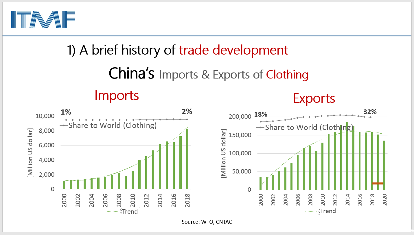 在过去的20年中,中国纺织品的出口涨势令人叹为观止,从大约100亿美元增长到超过1300亿美元。而在2020年这个特殊的年份里,中国纺织品出口甚至可能超过1500亿美元。而中国纺织品进口增长维持在较低水平,其在全球占比有所下降。