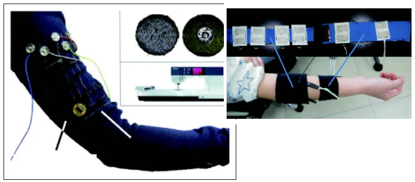 把电极绣在衣袖织物上可以记录肌电图,分析运动的动态,以识别肌肉激活和检测肌肉疲劳,帮助提高成绩和促进健康训练。同时,纺织电极还可以通过记录肌电图,用于高度精确地控制手和手腕的活动。
