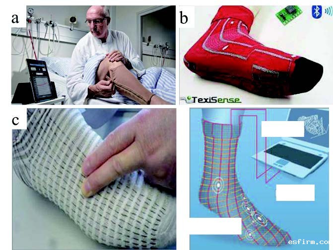 生物力学纺织传感器可以捕捉身体的运动,用来评估诸如帕金森氏症等影响运动技能的身体状况。诸如纱线式纺织传感器被放置在关节(如膝盖或肘部)表面监测四肢的运动,用于康复和训练,以及监测喉部、眼角等部位微小变形;织物压力传感器集成在袜子或足底鞋垫/鞋中,满足脑卒中后康复和糖尿病相关病理的临床患者的步态监测。